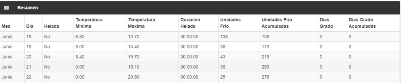 temperaturas “heladas”, días-grado, unidades de frío y horas sobre 30°C.